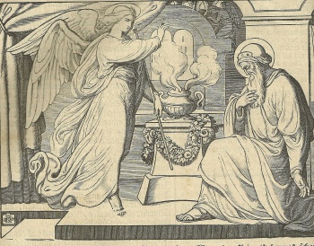 Eines Tages nun, da Zacharias das Rauchopfer darbrachte und das Volk draußen im Vorhofe betete, sah er zur Rechten des Altars einen Engel stehen. Er erschrak und fürchtete sich sehr; Der Engel sprach ihm Mut ein und kündete ihm an, dass sein Gebet erhört sei und sein Weib Elisabeth einen Sohn gebären werde den er Johannes nennen solle. "Viele", fuhr der Engel fort, "werden sich über seine Geburt erfreuen; denn er wird groß sein vor dem Herrn; er wird im Mutterleibe schon mit dem heiligen Geiste erfüllt werden, viele Menschen zum Herrn bekehren und ihm ein vollkommenes Volk bereiten [Luk.1.]." Verwundert über diese Worte, wollte Zacharias nicht glauben; denn er selbst war schon im hohen Alter und auch sein Weib schon hochbetagt. Lange Zeit schon hatte er zu Gott gefleht um ein Kind und er wurde nicht erhört; schon hatte er den Gedanken, ein Kind auf seinen Arm zu sehen, aufgegeben, als der Engel ihm diese Gnade verkündete; es kam ihm Alles unglaublich vor. Da aber sprach der Engel: "Ich bin Gabriel, der vor Gott steht, und ich bin gesandt worden, dir diese frohe Botschaft zu bringen. Und siehe, du wirst stumm sein und nicht reden können bis zu dem Tage, da dies geschehen wird, weil Du meinen Worten nicht geglaubt hast."