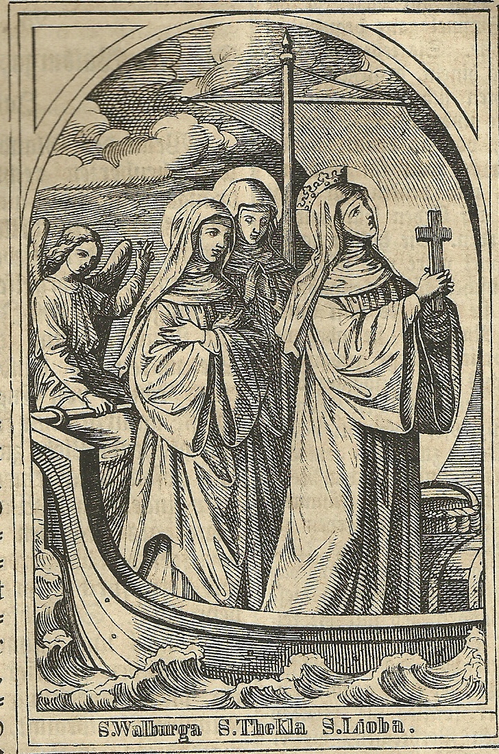 1S. Walburgis. V. Abbat. (25. al. 4. Febr., 27. Apr., 1. Mai, 4. Aug., 12. Oct.). Diese hl. Abtissin und berühmte Wunderthäterin hat viele Lebensbeschreiber gefunden. Schon der hl. Wilibald, ihr Bruder, wurde zu denselben gezählt, aber bis jetzt ist nichts gefunden worden, was diese Angabe bestätigen könnte. Aber in den über ihn und den hl. Wunibald vorhandenen Lebensbeschreibungen ist sie öfter erwähnt. Die erste Biographie ist von dem Benedictiner Wolfhard von Hafenried, welche eine Widmung an Bischof Erchanbald von Eichstädt (vom Jahr 884-809) an der Spitze trägt. Sie steht bei den Boll. an vierter Stelle; doch handeln nur die ersten fünf Capitel von ihrem Leben und Hinscheiden. Ihm folgte Bischof Adelbold von Utrecht, um das J. 1008. Ein sonst unbekannter Medibardus (Medingaudus) schrieb ihr Leben in Versen (Prosam Wolfhardus, rhythmum fecit Medibardus). Auch der Verf. der bei den Boll. an zweiter Stelle abgedruckten Lebensbeschreibung ist unbekannt. Die Klosterfrauen von St. Walburg in Eichstädt haben gleichsam Nachlese gehalten, und wie schon Wolfhard eine Sammlung der am Grabe der hl. Abtissin geschehenen Wunder beifügen. lassen (gedruckt im J. 1594). Aeltere Denkmäler, welche bereits dem 9. Jahrh. angehören, und ihre Verehrung bestätigen, sind die schon zu jener Zeit ihr geweihten Kirchen und Altäre. Von spätern Bearbeitungen nennen wir: Crammer, heil. und gottsel. Eichstädt, S. 67-72, Eichstädt u. München 1780; Reichmayer, J. E., Lebensbeschreibung der heil. Aebtissin Walburgis, Eichstedt 1792; Hauber, die hl. Walburga und ihre gottselige Verwandtschaft, Augsburg, 1840; A. Schmid, S. J. Leben der hl. Walburga und ihrer heil. Brüder Willibald und Wunibald, Eichstätt 1850 und 1867. Zu nachfolgender Darstellung wurden auch die Bemerkungen Mabillons, der Commentar von Henschen, und andere Hilfsmittel, wie z. B. Rettbergs K.-G. Deutschlands, beigezogen. Die hl. Abtissin von Heidenheim welche auch Walburga, Gualburgis, Walpurga, Wallpurgis, selbst Wairurgis genannt wird, war (nach Angabe der zweiten Biographie des hl. Willibald) eine Tochter des hl. Fürsten Richard von England und (wahrscheinlich Stief-) Schwester der hhl. Willibald und Wunibald, und etwa um das J. 710 in England geboren. Als ihr Vater und ihre Brüder eine Wallfahrt zu den Gräbern der Apostelfürsten unternahmen, nahm sie wahrscheinlich den Schleier im Kloster Winburn (Winbrunn) in der Grafschaft Dorset. Andere fromme Schriftsteller geben an (Mabillon, l. c. IV. 347), daß sie diese Reise mitgemacht, und selbst die hl. Stätten in Palästina besucht habe. Gewiß ist, daß die hl. Walburgis auf Berufung des heil. Bonifacius in Gesellschaft der heil. Lioba und anderer Ordensschwestern um das Jahr 748 nach Deutschland kam, und zwei Jahre im Kloster Bischofsheim an der Tauber lebte. Indessen hatten ihre heiligen Brüder zu Heidenheim, am Hahnenkamm, außer einem Kloster für Männer, welchem der hl. Wunibald vorstand, auch ein solches für Frauen errichtet. Der hl. Willibald setzte dort seine Schwester als Abtissin um das J. 754 ein. Tag und Nacht, sagt ihre älteste Lebensgeschichte, verharrte sie im Gebete, immer oblag sie dem Wachen und Fasten, ihren Leib hielt sie von frühester Jugend in keuscher Zucht, das beständige Vorbild ihres Wandels, ihre einzige Zuflucht war und blieb ihr göttlicher Bräutigam, den sie unablässig anrief, daß Er, der sie im Glauben stark gemacht hatte, sie auch am Leibe rein erhalte. Sie war aber nicht Klosterfrau mit strenger Clausur, welche der weiblichen Missionsthätigkeit, der sie obliegen mußte, auch gar nicht entsprochen hätte, wie zwei wunderbare Vorfälle in ihrem Leben beweisen. Einst kehrte sie in finsterer Nacht aus der Kirche des Männerklosters, wo sie der Vesper beigewohnt und länger verweilt hatte, zu ihrem Kloster zurück. Der Custos dieser Kirche, Namens Goumeradus, hatte ihr keine Laterne gegeben, und sie war genöthigt, in der dunkeln Nacht ohne Licht das Kloster aufzusuchen. Die Ordensschwestern hatten bei ihrer Ankunft schon gespeist, und Walburgis ging ungespeist zu Bette. Als man aber um Mitternacht das Zeichen zur Mette gab, entstand plötzlich eine wunderbare Helle, welche alle Schlafgemächer und selbst den Boden durchdrang. Die hl. Abtissin pries den Herrn und dankte ihm mit lauten Worten, daß er sich würdigte, durch die milden Strahlen seiner Barmherzigkeit die Finsternisse des Schreckens zu verscheuchen. Als ihr Bruder Wunibaldim J. 761 mit Tod abgegangen, und sie über seinen Heimgang noch sehr im Herzen betrübt war, ging sie Nachts zu dem Hause eines reichen Gutsherrn zu Hohentruhendingen, dessen Tochter, wie sie wußte, am Sterben lag. Als dieser sie vor der Thüre seines Hauses stehen sah, ohne sie zu erkennen, forderte er sie auf, schnell einzutreten, damit sie nicht von seinen Hunden angefallen werde. Sie aber sprach: »Der mich unversehrt und ohne dein Wissen hieher geführt, wird mich auch unversehrt hinwegführen, ja Er wird auch, wenn du mit allen deinen Kräften an Ihn, als den Arzt der Aerzte glaubst, in dein Haus die Gabe der Gesundheit bringen.« Die Heilige ließ sich ins Gemach der Sterbenden führen, um welche die betrübten Eltern bitterlich weinten, und brachte die Nacht unter inständigem Gebete im Krankenzimmer zu. Als aber der Morgen graute, stand das Mädchen gesund aus dem Bette auf. Die hocherfreuten Eltern empfahlen sich ihren frommen Gebeten, und wollten die hl. Walburgis mit Geschenken belohnen; sie aber nahm nichts an und kehrte, Gott dankend, zu den Ihrigen zurück. Daß sie auch den Mönchen als Abtissin vorgestanden sei, wie viele Neuere sagen, ist aus Wolfhards Lebensbeschreibung nicht ersichtlich2. Im J. 761 wohnte sie der feierlichen Beerdigung des hl. Wunibald in Heidenheim bei, worauf sie nach einigen Autoren am 25. Febr. 779, nach Andern im J. 780 oder später, im Herrn entschlief. Ihr heil. Leib wurde in dem Kloster Heidenheim beerdigt, um die Mitte des 9. Jahrh. aber durch den Bischof Otga