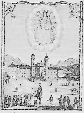 — Mehrere Feuersbrünste zerstörten seit dieser Zeit die Kirche, die Kapelle aber ward wunderbar erhalten. Auch da die calvinische Lehre in den stillen Tälern der Schweiz sich ausbreitete, und durch diese der Kapelle die Zerstörung drohte, ward sie gerettet. Als aber die französische Revolution in die Schweiz eindrang, ließ es der Herr zu, daß sie zerstört wurde; doch das heilige Gnadenbild ward noch zur rechten Zeit gerettet. Nachdem der Sturm der Revolution endlich vertobt hatte und die verbannten Klostergeistlichen wieder zurückkehren durften, wurde das Gnadenbild am 29. Sept. 1803 mit aller möglichen Feierlichkeit unter dem Andränge einer uugeheueren Menge Volkes zurückgebracht, und widerum an der nämlichen Stelle auf einem schön errichteten Altare zur Verehrung ausgestellt.