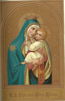 Karmel ist ein Berg, der in Palästina und am Mittelmeer liegt. Auf diesem Berge Karmel, an der Stelle, wo einst der Prophet Elias eine Wolke herniedersteigen sah, die man schon früher als ein Sinnbild der gnadenvollen, unbefleckten Jungfrau Maria gedeutet hatte, lebten frühzeitig fromme Christen von der Welt zurückgezogen, voll Eifer im Gebete und in Bußübungen und besonders beflissen, Maria, die Mutter Jesu, des Sohnes Gottes, als ihre Fürbitterin und Beschützerin zu verehren. Diese Brüder vermehrten sich bald, und der selige Albert, Patriarch von Jerusalem (+ 1214), gab ihnen eine bestimmte Ordensregel; nun wurden sie Brüder vom Berge Karmel genannt. Dadurch entstand der Karmelitenorden, der zur Zeit der Kreuzzüge und durch die Verfolgung der Sarazenen sich im Abendlande und zwar zuerst in England verbreitete.